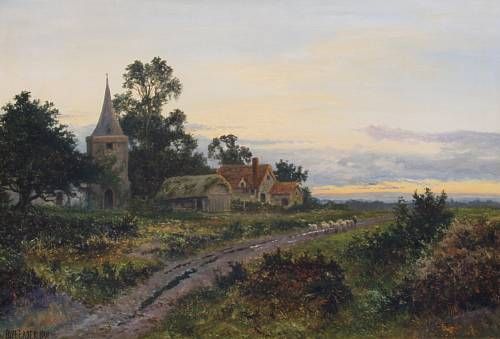 | Drover and sheep by a hamlet at dusk | |