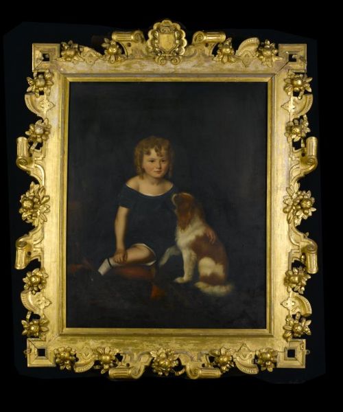 PORTRAIT OF A CHILD WITH A KING CHARLES SPANIEL ON A TURKEY CARPET
