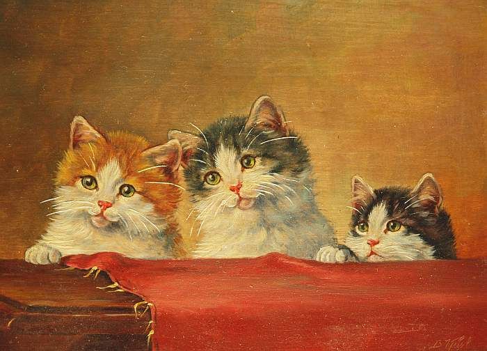 Drei jungen Katzen neugierig zum Betrachter rechts schauend.