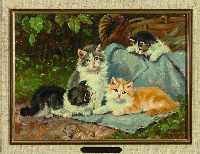 Vier spielende Katzen auf blauem Tuch