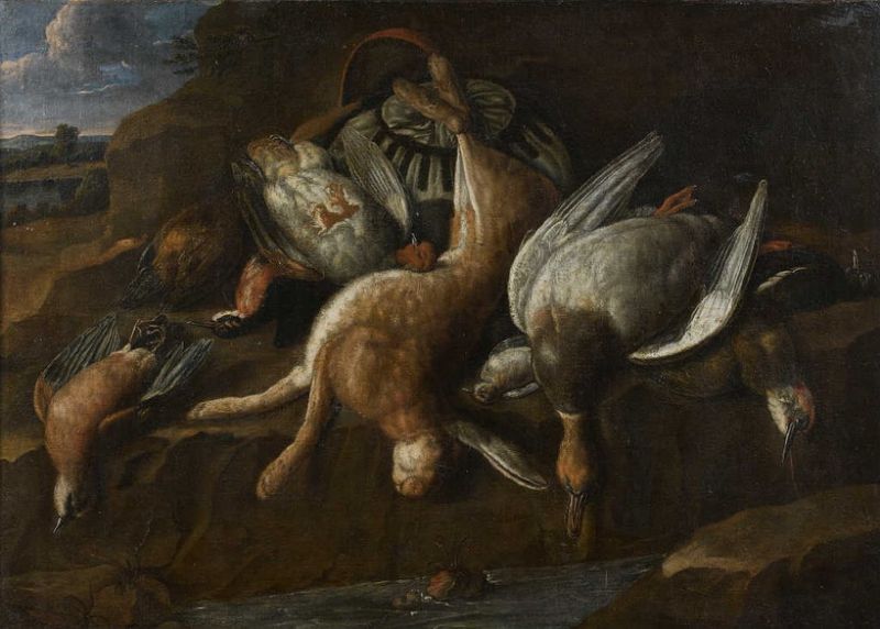 Nature morte au lièvre, col vert, pic et pêche, martin pêcheur, perdreau