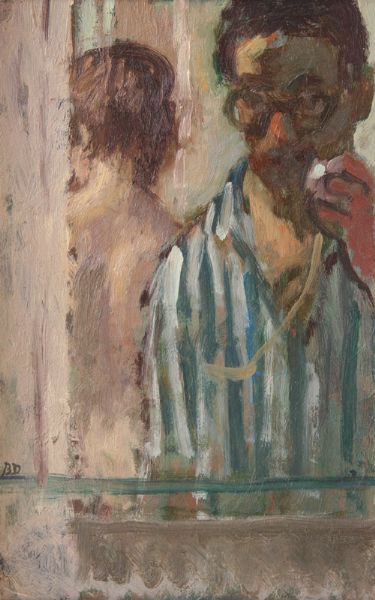 | Bathroom Interior with a Man shaving in his Striped Pyjamas before a Female Nude reflected in a Mirror | |