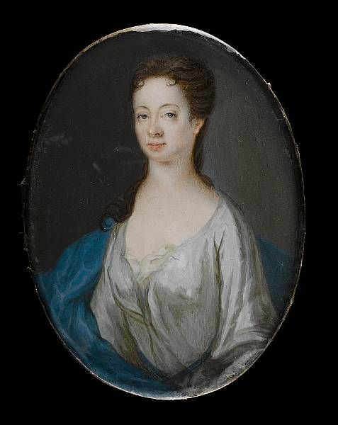 | A Lady, wearing grey dress, white underslip and blue cloak, her dark hair falling over her right shoulder | |