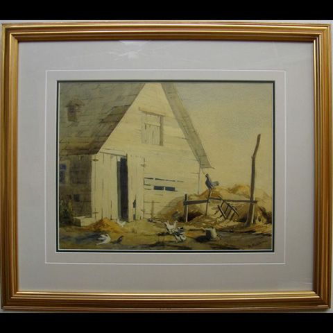 SUNLIT FARMYARD WITH CHICKENS AND BIRDS