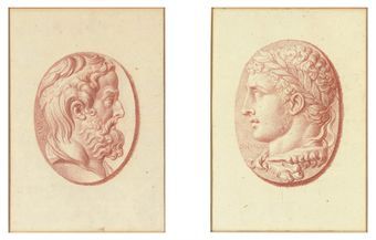 | Four studies after cameos, three with classical profile portraits and one with a fragmentary relief of Cupid and two lions drawi | |