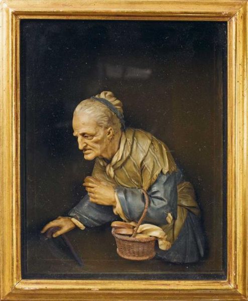 A POLYCHROME WAX RELIEF "OLD WOMAN WITH A WALKING STICK AND A BASKET"