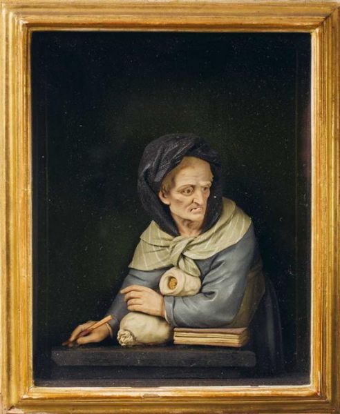 A POLYCHROME WAX RELIEF "THE STINGY OLD WOMAN"