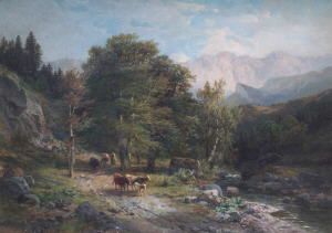 Bewaldetes Gebirgstal mit Kühen und Hirtin