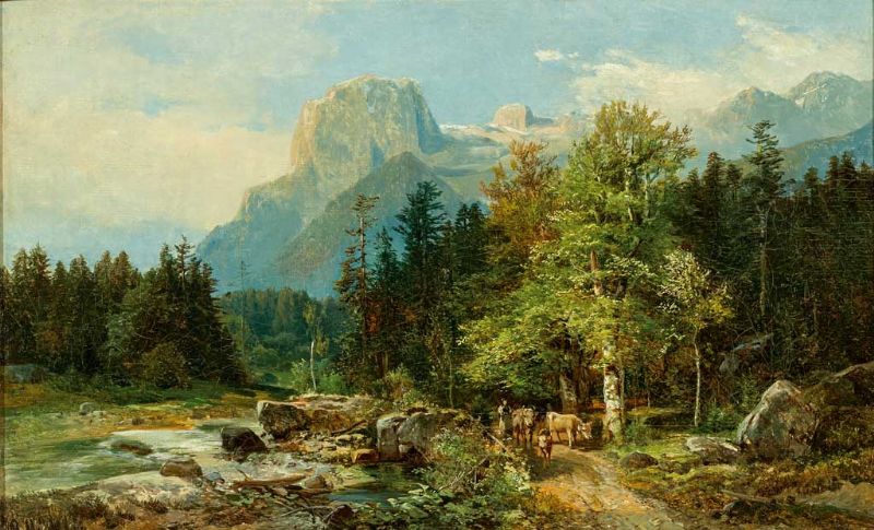 Hochgebirgslandschaft mit Gebirgsbach, an dessen Ufer eine Hirtin Kühe zur Tränke führt