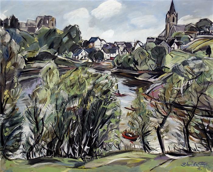 Impressionistische Dorfansicht an einem bewaldeten Seeufer