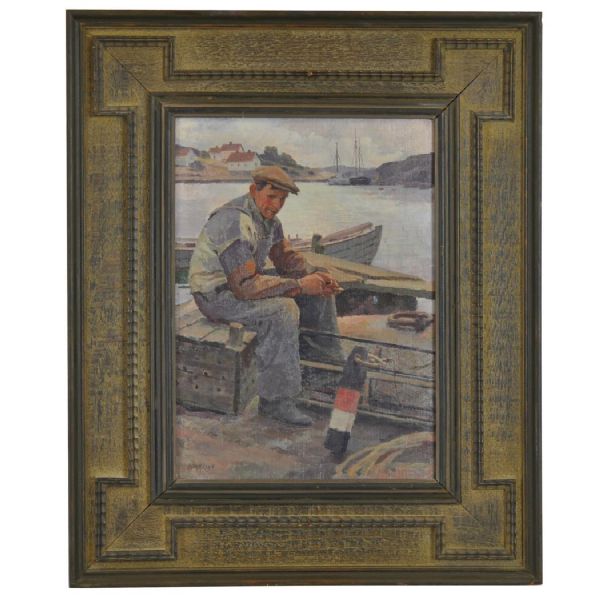 Hamnbild med sittande man.