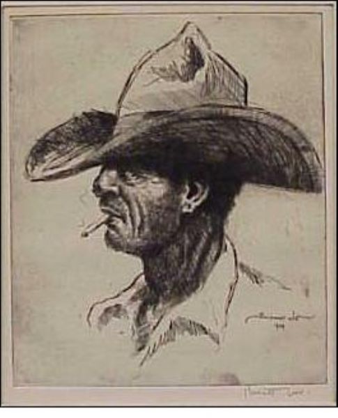Depicts a cowboy smoking