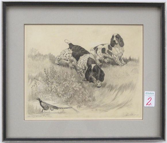 Two English Springer Spaniels with pheasant in foreground