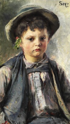Portrait of the boy Sepp wearing a hat and a little twig behind the ear