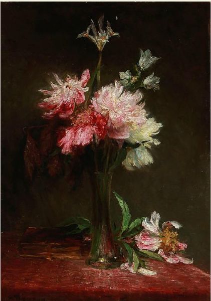 Still life with iris and peonies in a vase.