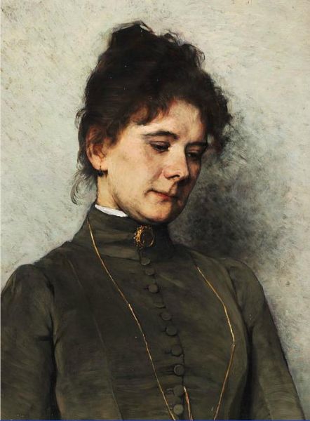 | Young reflecting woman with dark curly hair and a grey dress decorated with a medallion. | |