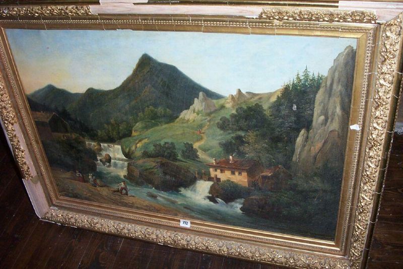 | a continental landscape with mountain, waterfall, seated lady artist painting the view, further figures and dog etc | |