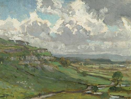 An extensive landscape with cattle watering and a fisherman by a riverside