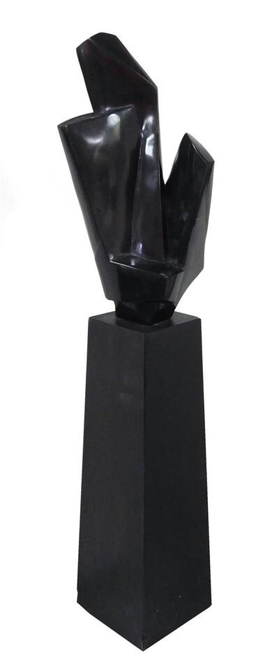 ) "Ad Infinitum," black composite medium mounted on wooden pedestal, 29" h. x 16" w. x 10" d., abstract composition depicting interplay of smooth, rock-like forms, sculpture tapers to narrow base, minor wear including isolated minor loss to edge, 29" | |