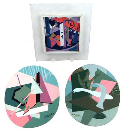 three oil on board paintings: cubist still-life with fruit, plants and geometric shapes, framed, signed LR, minor scratches, not examined out of frame, ss: 6" sq.; pair of oval form paintings depicting abstract compositions with geometric pink, green | |