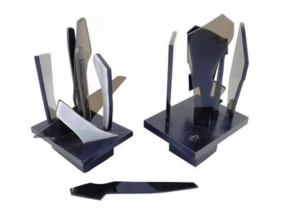 pair of small plexiglass sculptures, jagged vertical forms in black, white, and transparent plexiglass attached to wooden bases, possibly maquettes for "Shadows" the large scale version (insert lot number for sale), minor wear, some pieces loose and | |