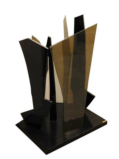 "Shadow," plexiglass compostion on wooden base, artist's name plaque on base, abstract sculpture with six jagged plexiglass forms arranged vertically on wooden base, three shapes in transparent material, three in darker black material, expected minor | |