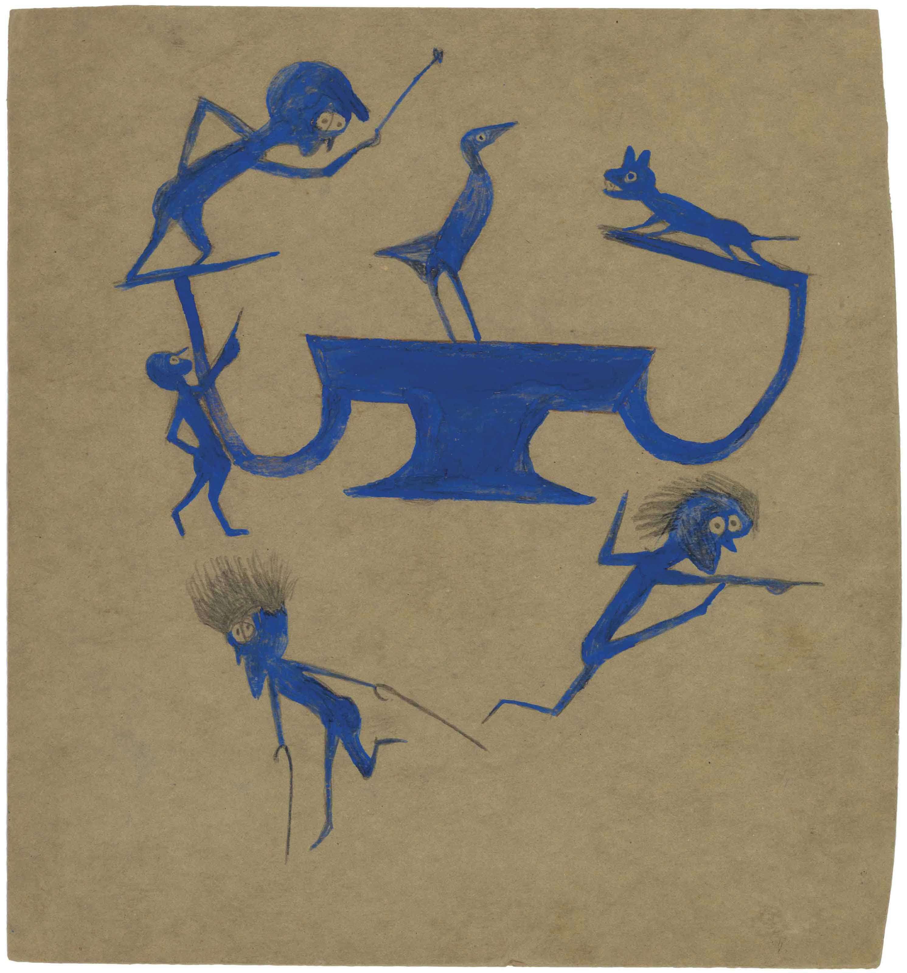 | Exciting Event in Blue: Four Wild Men, Barking Dog, Perched Bird and Construction | |
