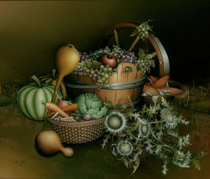 Stilleben mit Früchten, Kelter, Gemüse und Disteln