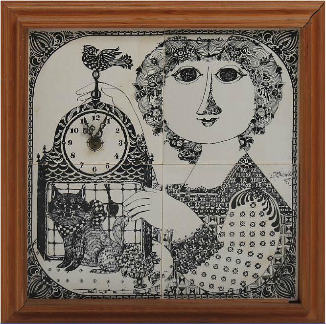 Wall clock with four tiles with motif in white and black glaze