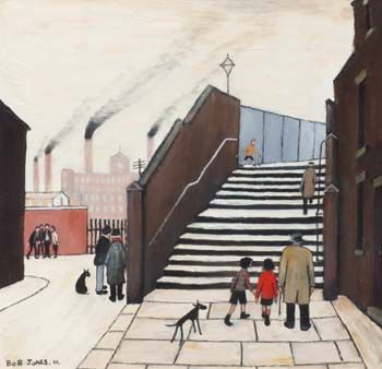 Lowry crossing a footbridge in Pendlebury