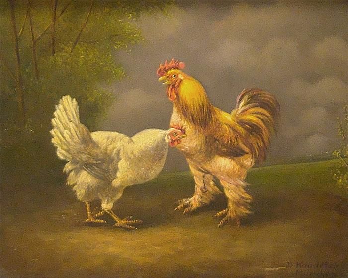 Pendants: Verschiedene Hühnerpaare in Landschaft.
