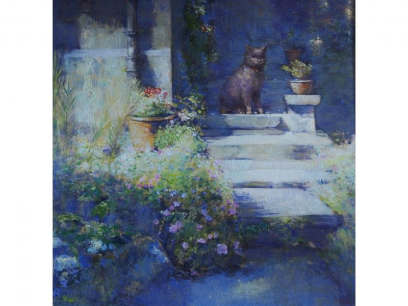 An anthropomorphic cat sat upon stone steps in a garden