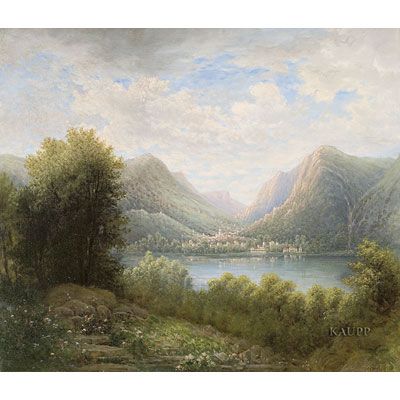 Sommerliche alpine Landschaft mit Gebirgssee und kleiner idyllischer Ortschaft am Ufer.