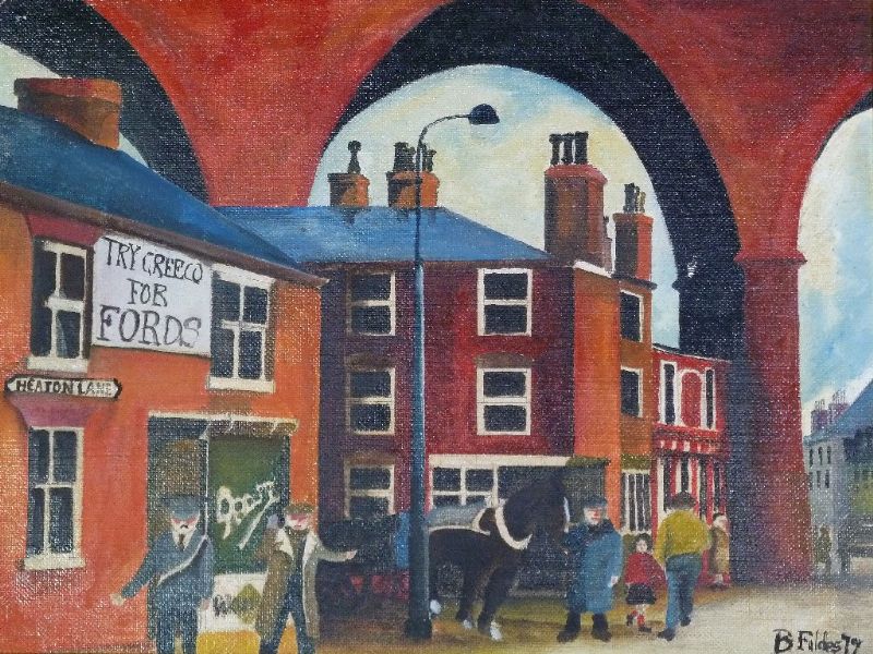 Stockport street scene 'Heaton Lane' with viaduct in the background
