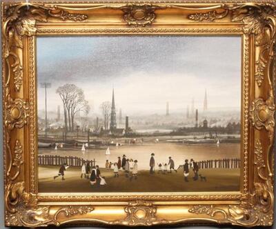 | Figures Near a Boating Lake, Industrial Town Beyond | |