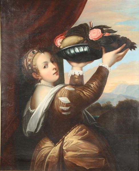 Portrait of a Renaissance lady holding a bowl of fruit and flowers