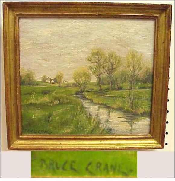 | Summer landscape with buildings in background, stream and trees in foreground | |