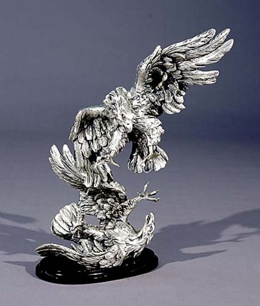 Bronze with silver finish, on wood base