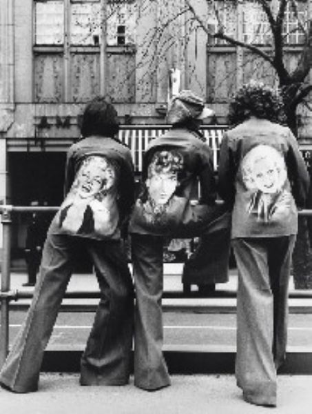 Models wearing Fiorucci hand painted denim jackets and flared jeans