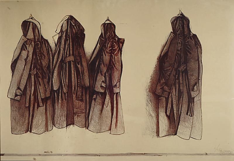 Vier Mäntel; 2 Männer mit Tüchern vor dem Gesicht