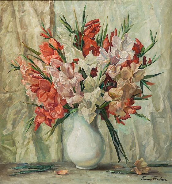 Bunter Gladiolenstrauß in weißer Porzellanvase vor weißem Seidenvorhang