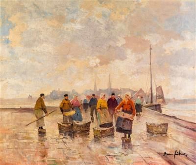 | Niederländische Hafenstadt mit Fischern, die ihren Fang an Marktleute verteilen | |