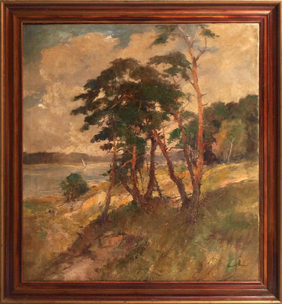 | Sommerliche Partie an der Ostsee, im Vordergrund eine Kieferngruppe, am Ufer eine Gruppe Spaziergänger. In der Ferne ein Segelbo | |