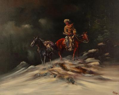 ''Unexpected Intruder'', cowboy on horseback with pack horse