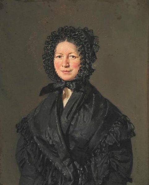 Portrait of mrs Henneberg in a black coat, black shawl and bonnet.