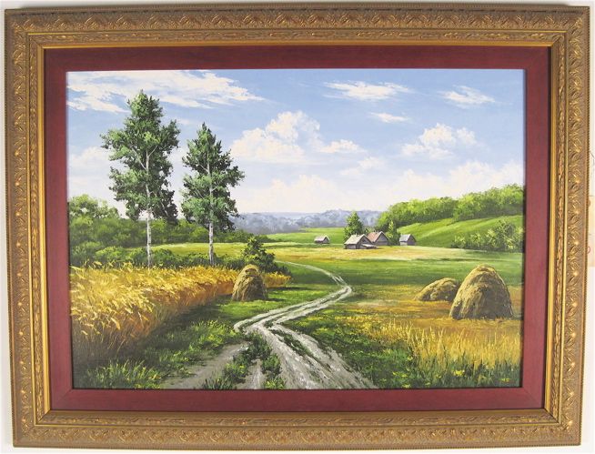| A summer landscape in the Ukraine with shocks of hay, birch trees, houses in the distance | |
