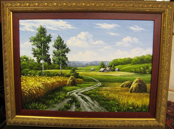 | A summer landscape in the Ukraine with shocks of hay, birch trees, houses in the distance | |