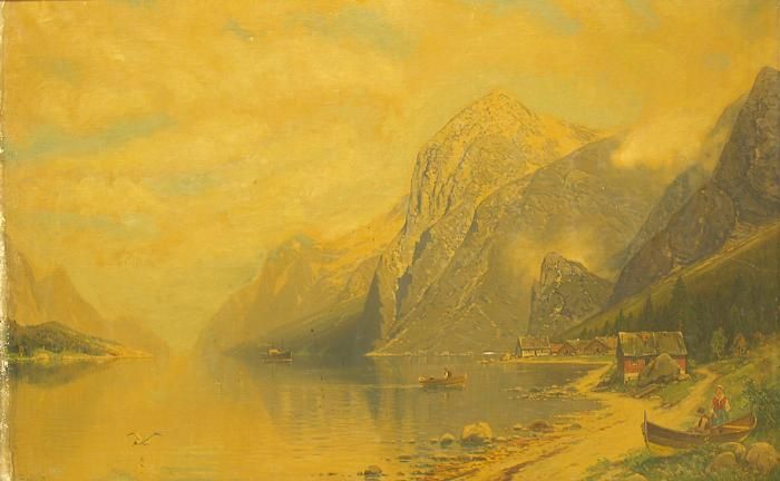 Nebelverhangener Fjordlauf mit Dampfschiff und Ruderer vor Dorfkuliss