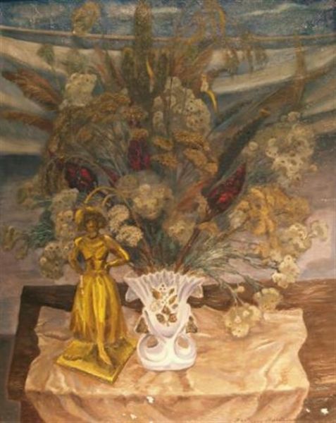Still Life with Flowers and a Bronze Figure before a Curtain
