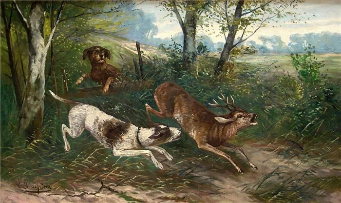 Jagdszene mit 2 Hunden und Rehbock